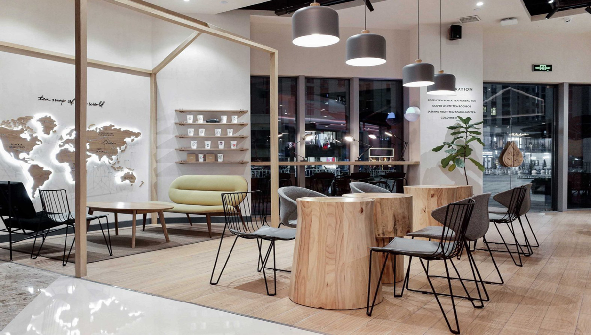 项目地址位于杭州滨江区龙湖天街店。因茶的起源,想到了禅意从而采用实木原木原墩桌,在每一处配不同色及家具,显得空间更生动灵活。