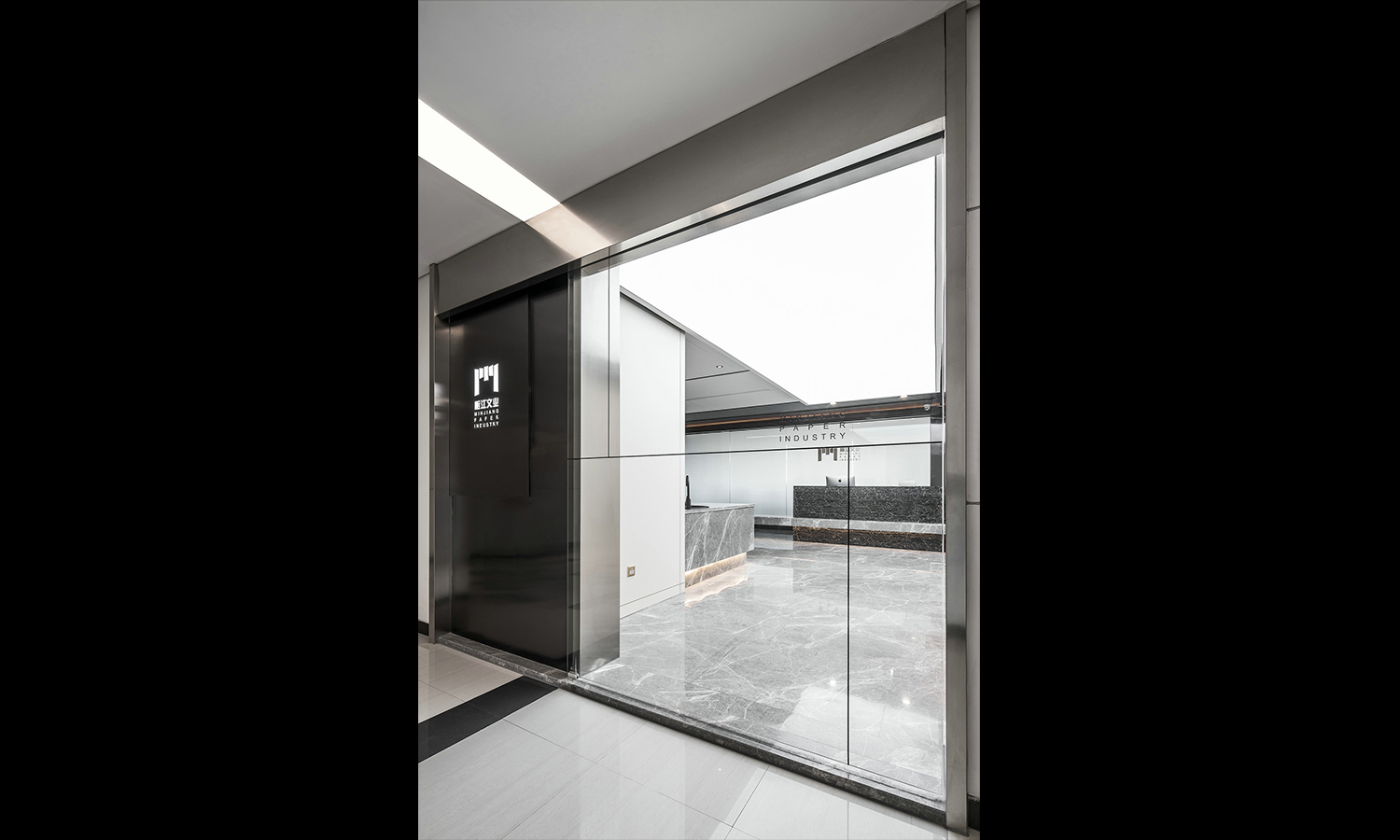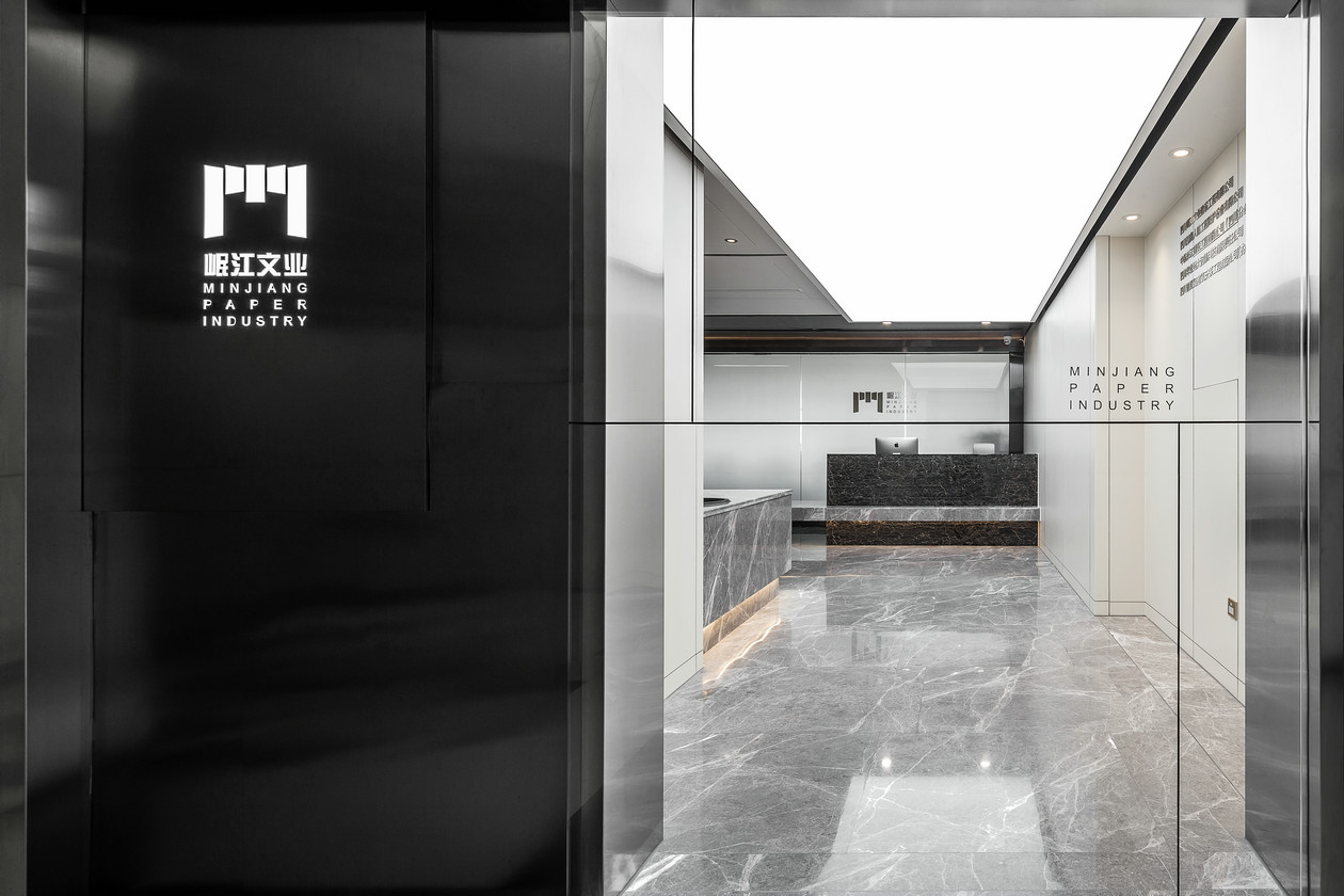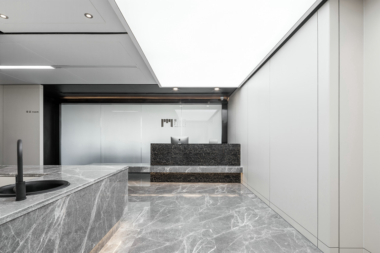 白色的写字楼楼道间,黑色的企业形象墙,通透的玻璃大门把明亮的公司大厅彰显出来,整体视觉透露着稳重而不失优雅,崭新的企业形象气质被提升璀璨。空间以面的形式构思设计,大块面的用颜色分割,运用黑白灰不同材质进行搭配。天花整面的发光软膜、地面整面的灰色大理石、墙面整面的米色烤漆板、吧台整面的黑色大理石结构。企业的形象在玻璃背景的一角展现,随着功能的变化,玻璃背景即可通透也可隐蔽,隐约中把后面的会议空间映出。通过门厅来到过道区,整面的烤漆板干净利落,墙面巧妙的拉缝处理完全隐蔽了门的存在,让过道区视觉效果更加完整。整体设计体现了企业积极向上的文化精神,以卓越品质和竭诚服务为宗旨拉开了全新的企业篇章。