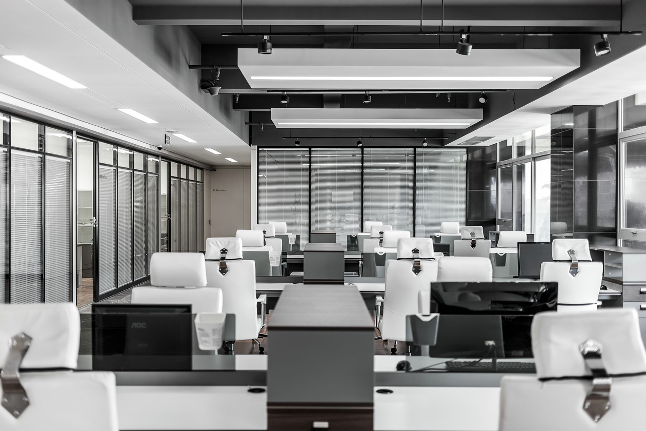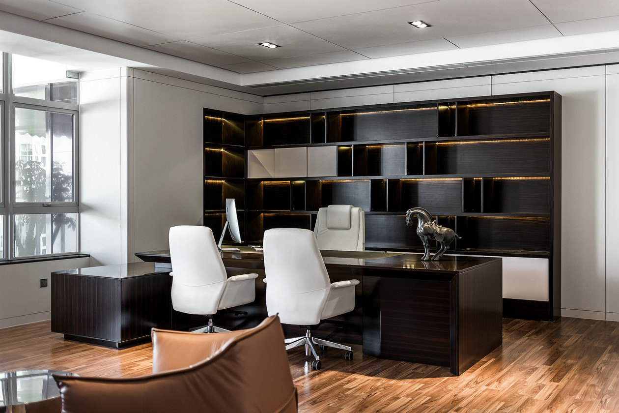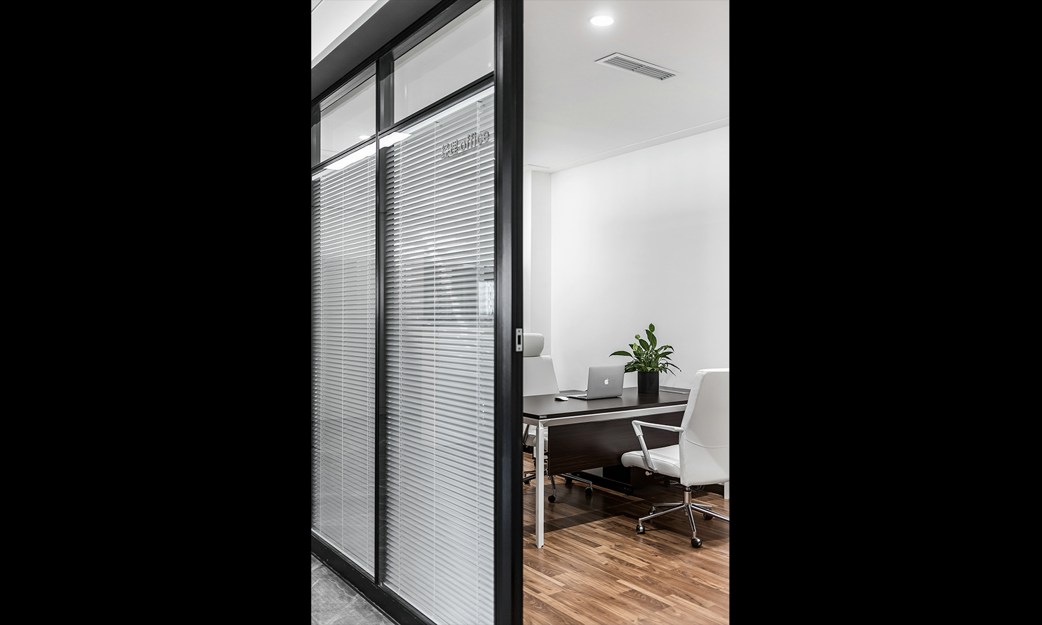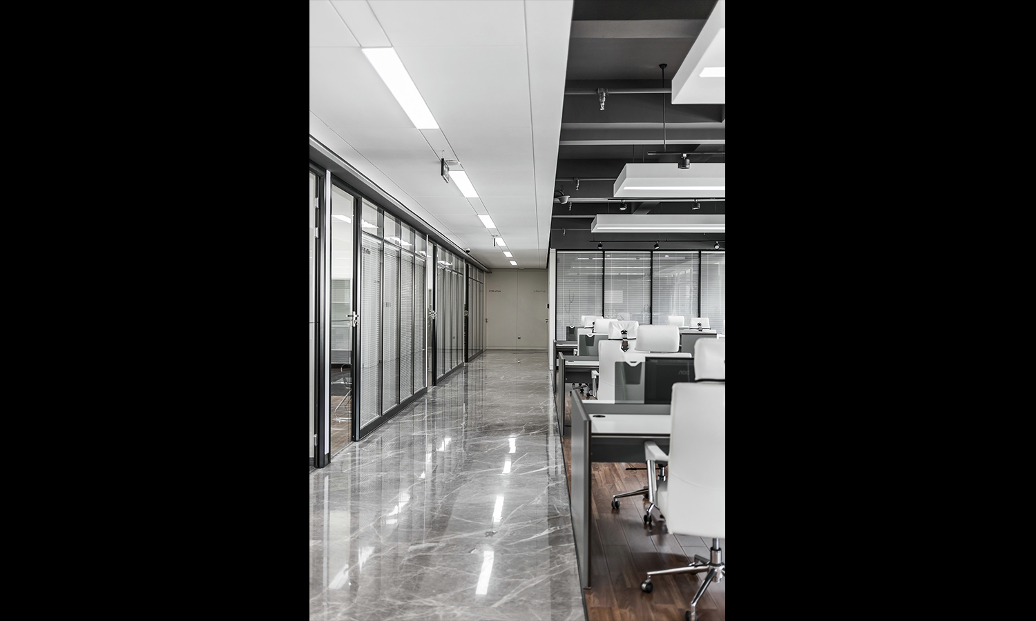 在功能上考虑到了员工的工作环境和活动空间,设计把空间面积中最大的阳台区给了公共办公区,开放的沟通环境和良好的采光是办公区设计的基本。同样块面化的天花设计和地面设计把过道和办公区域合理分开,透过横竖灯带拉出线条感,一整面的可调节百叶隔断墙把独立办公室空间划分出来,解决了兼顾管理和洽谈的通用功能。会议室简洁的天花造型结合深色的会议背景墙,营造出了一种轻松舒适的会议氛围。独立办公室内的设计同样秉承着优雅现代的风格,运用线、面的方式表达着各自的功能定位。